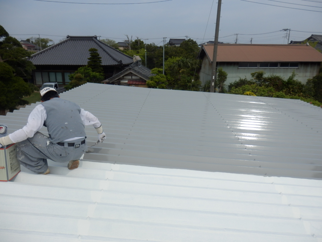 本日は、千葉県匝瑳市のS様邸にて折板屋根の塗装工事を行ってます。